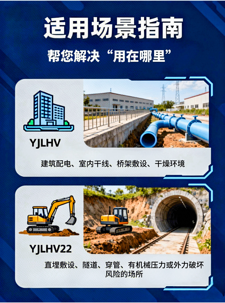 适用范围:适用于90℃下干燥或潮湿场所;可室内、室外安装,可垂直安装,也可托架或沿墙敷设,也可地下直埋安装;弯曲半径最小为7倍外径,也可360°弯曲;适用于民用、商业、工业、大型场馆、娱乐场所、矿井、地铁以及各类级别危险地区等场所。